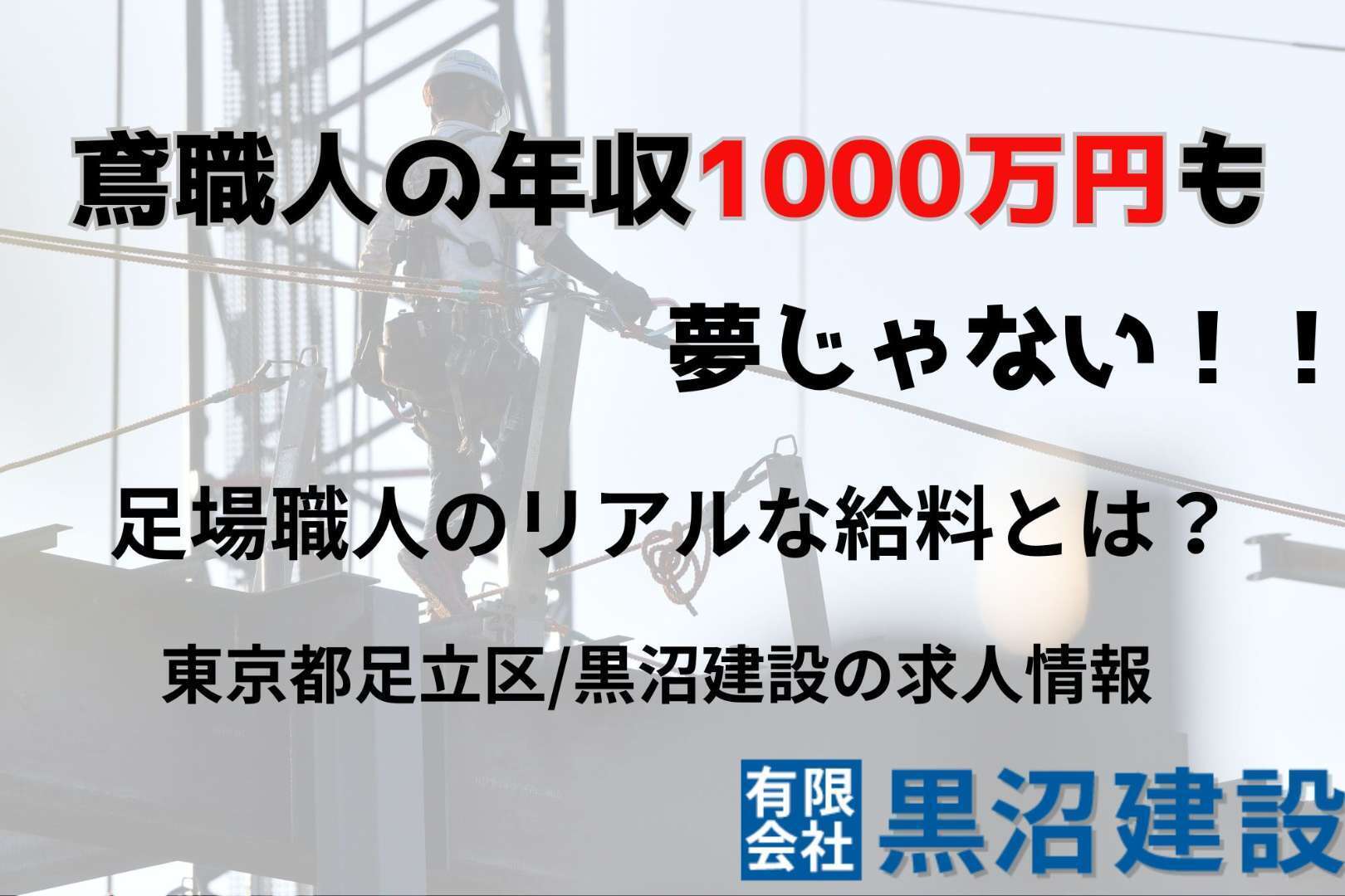 この記事では、東京都足立区で鳶工事を専門に手がける有限会社黒沼建設が、鳶職のリアルな年収・資格・仕事内容から求人情報まで、現場の声を交えてお伝えします。