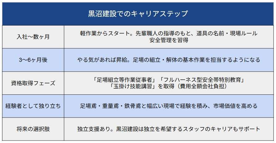 「足場職人になるにはどうすればいい?」と不安や疑問を感じている方も、ご安心ください。黒沼建設では、特別な資格がなくても、入社初日から現場で働き始めることが可能です。黒沼建設は未経験者をゼロから育てる環境を整備しており、1年目は軽作業からスタートできます!