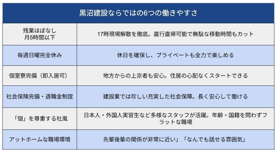 ●黒沼建設ならではの6つの働きやすさ