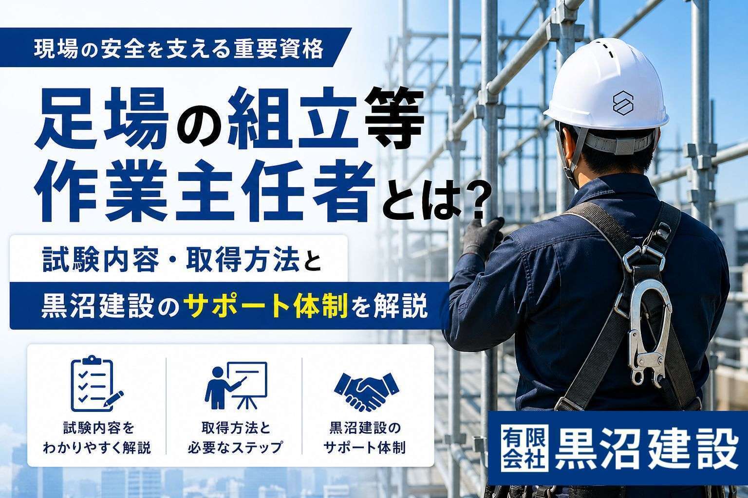 この記事では、現場の一作業員からチームを動かすリーダーへのステップに必要な「足場の組立等作業主任者」の資格について、試験内容や黒沼建設の取得支援制度などをわかりやすく解説します。