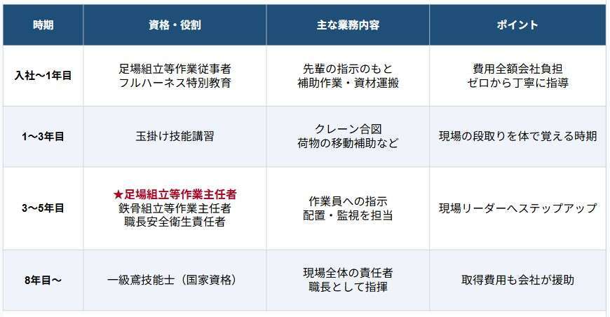 ●3年目〜:「足場の組立等作業主任者」「鉄骨組立等作業主任者」「職長安全衛生責任者」など