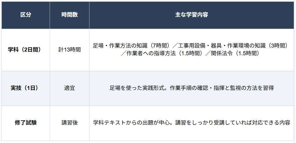 学科では専門用語も出てきますが、3年以上現場で働いた経験があれば、内容のほとんどはすでに知っているものです。テキストを読み返しながら整理していけば、十分対応できるでしょう。講習中の講師の話を集中して聞き、重要であると強調された点、特に安全規則や数値、組み立て手順などについて、メモを取りながら受講することが大切です。